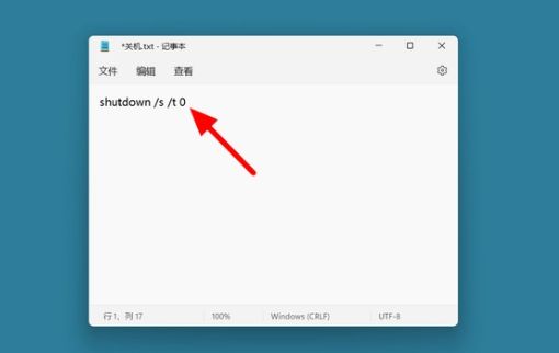 2、打开文本,输入“shutdown /s /t 0”,保存。