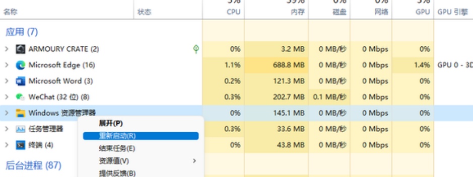 3、此时,右键菜单还没有变成Win10 的样子,需要重启电脑生效。如果你不想重启电脑,那么就在任务管理器中,重启一下“Windows资源管理器”。之后,鼠标右键就恢复正常使用了。