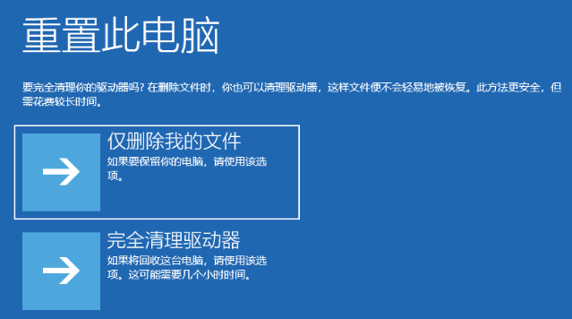 5、选择“仅删除我的文件”,如果重置不行再重复上述操作并选择“完全清理驱动器”即可。