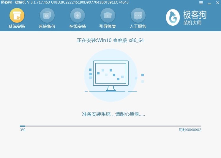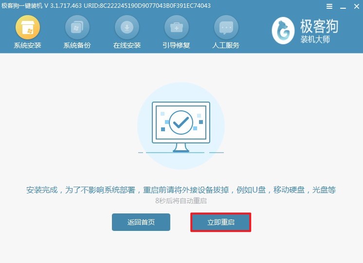 5、 极客狗开始弹出安装win10系统界面,等系统安装完成后“立即重启”电脑。
